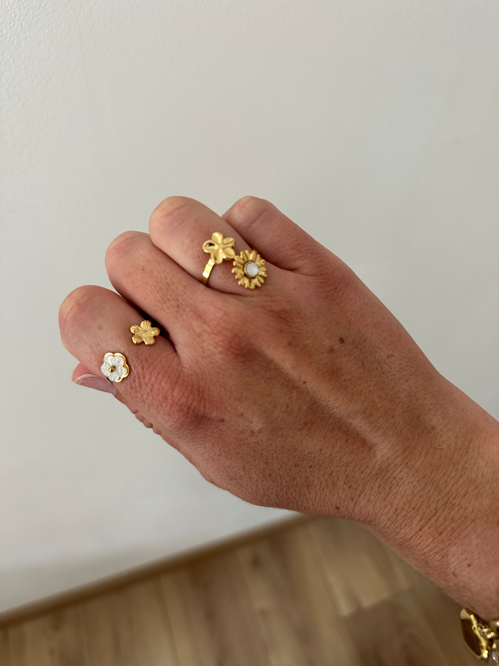 Apportez une touche florale et lumineuse à votre style avec cette bague ouverte en acier inoxydable doré. À chaque extrémité de l’anneau, une fleur stylisée : d’un côté une marguerite ornée d’un cœur en nacre blanche, de l’autre une fleur dorée finement sculptée.