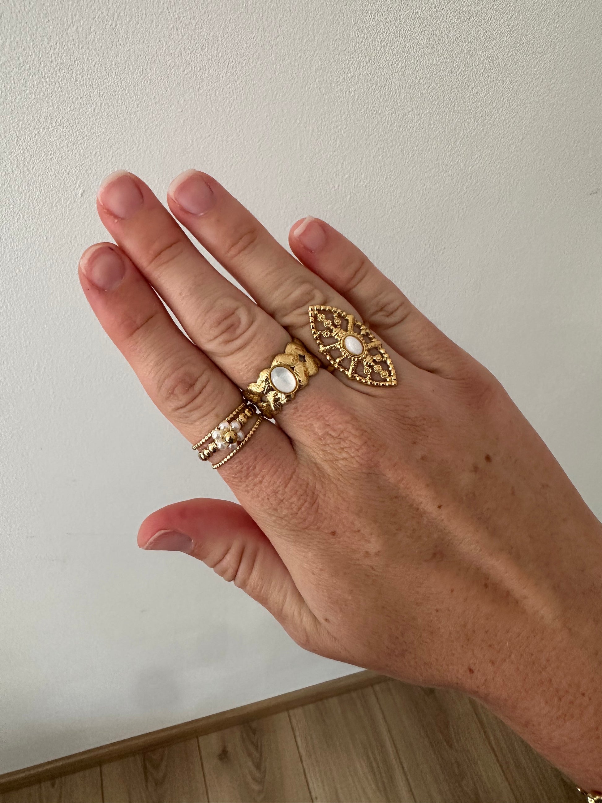 Disponible en plusieurs variations élégantes – vert, orange, gris ou blanc nacré – cette bague au diamètre d’environ 17 mm s’ajuste facilement au doigt par simple pression. Sa hauteur de tête de 8 mm et ses trois anneaux fins texturés créent un effet de volume tout en légèreté.