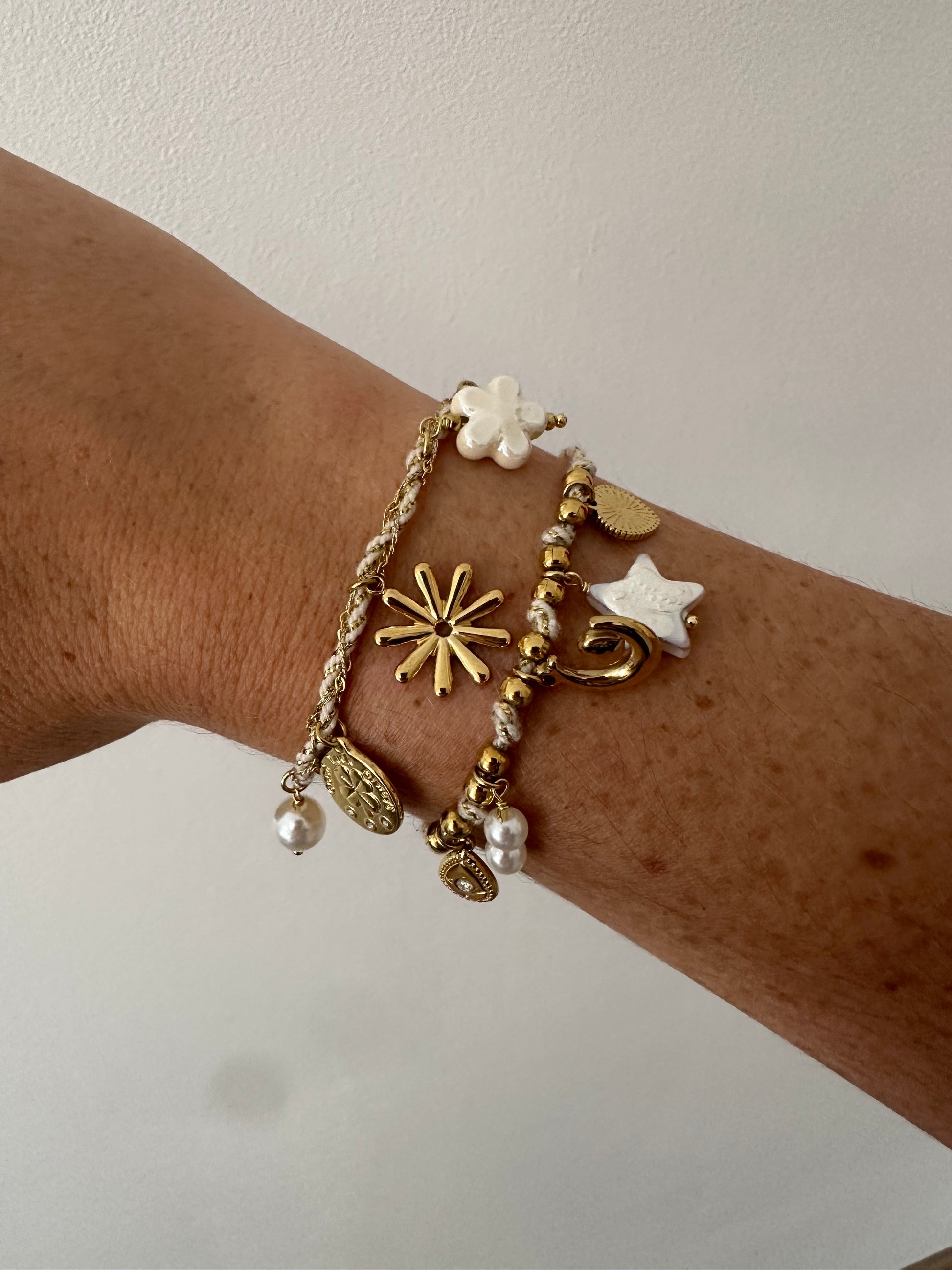 Ce bracelet au design soigné marie l’esprit fantaisie et les matériaux durables avec brio. Composé de pampilles dorées en acier inoxydable – pièce gravée “Good Luck Always”, fleur stylisée, papillon – associées à une perle acrylique et une fleur en céramique, il apporte une touche fraîche et joyeuse à toute collection de bijoux fantaisie. Le cordon chaîne tressé ajoute un effet artisanal tout en garantissant résistance et souplesse au porté.