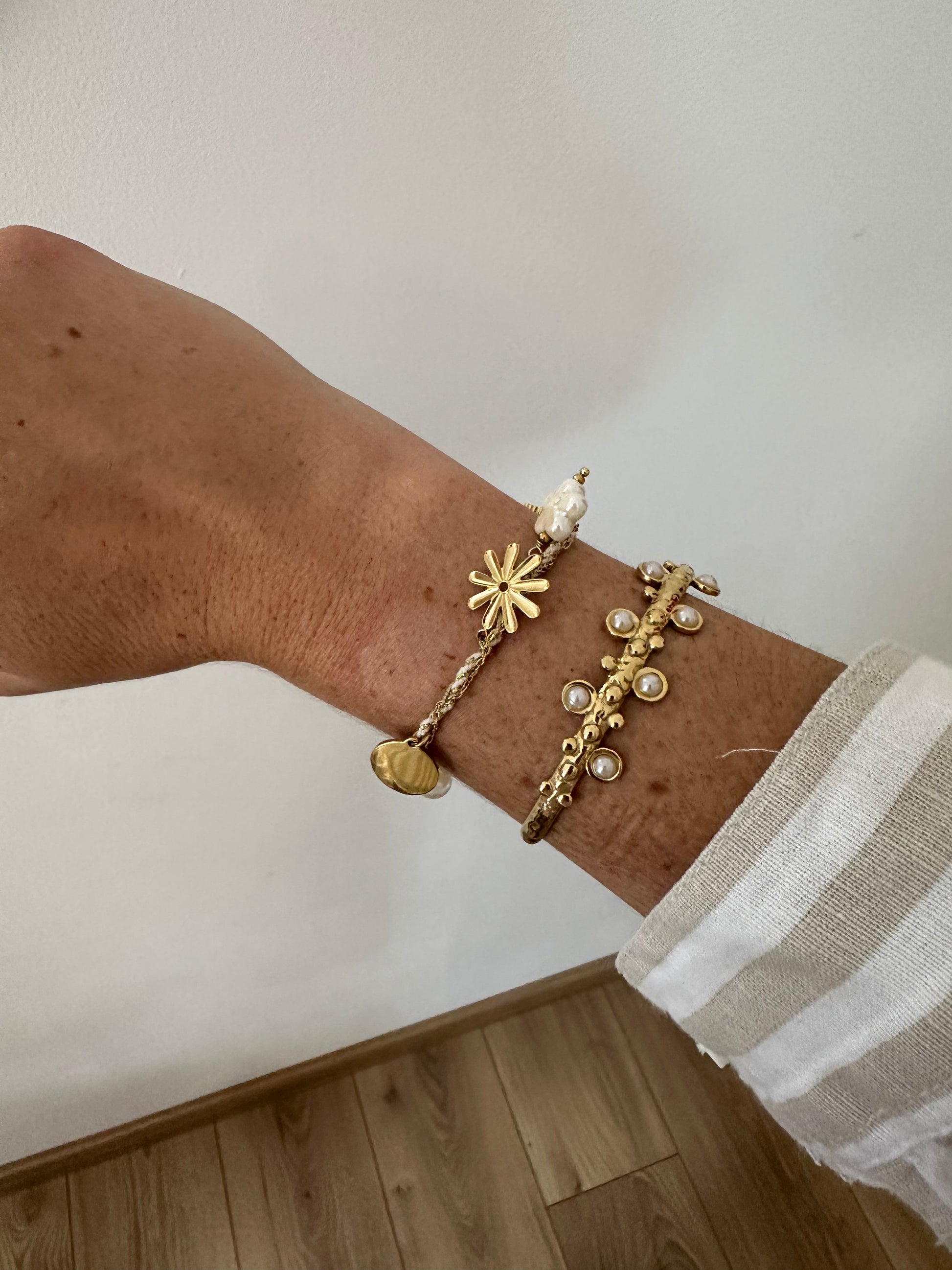 Voici ce bracelet jonc ouvert en acier inoxydable martelé avec des cabochons nacrés pour femme. Ce jonc en acier est ouvert et légèrement réglable. Les dimensions de ce bracelet sont de 15x60mm. Les cabochons sont disponibles en couleur blanc nacré. Ce bracelet fantaisie ne contient pas de nickel, plomb ni cadmium et est anti-allergique (conformément aux lois françaises et européennes).