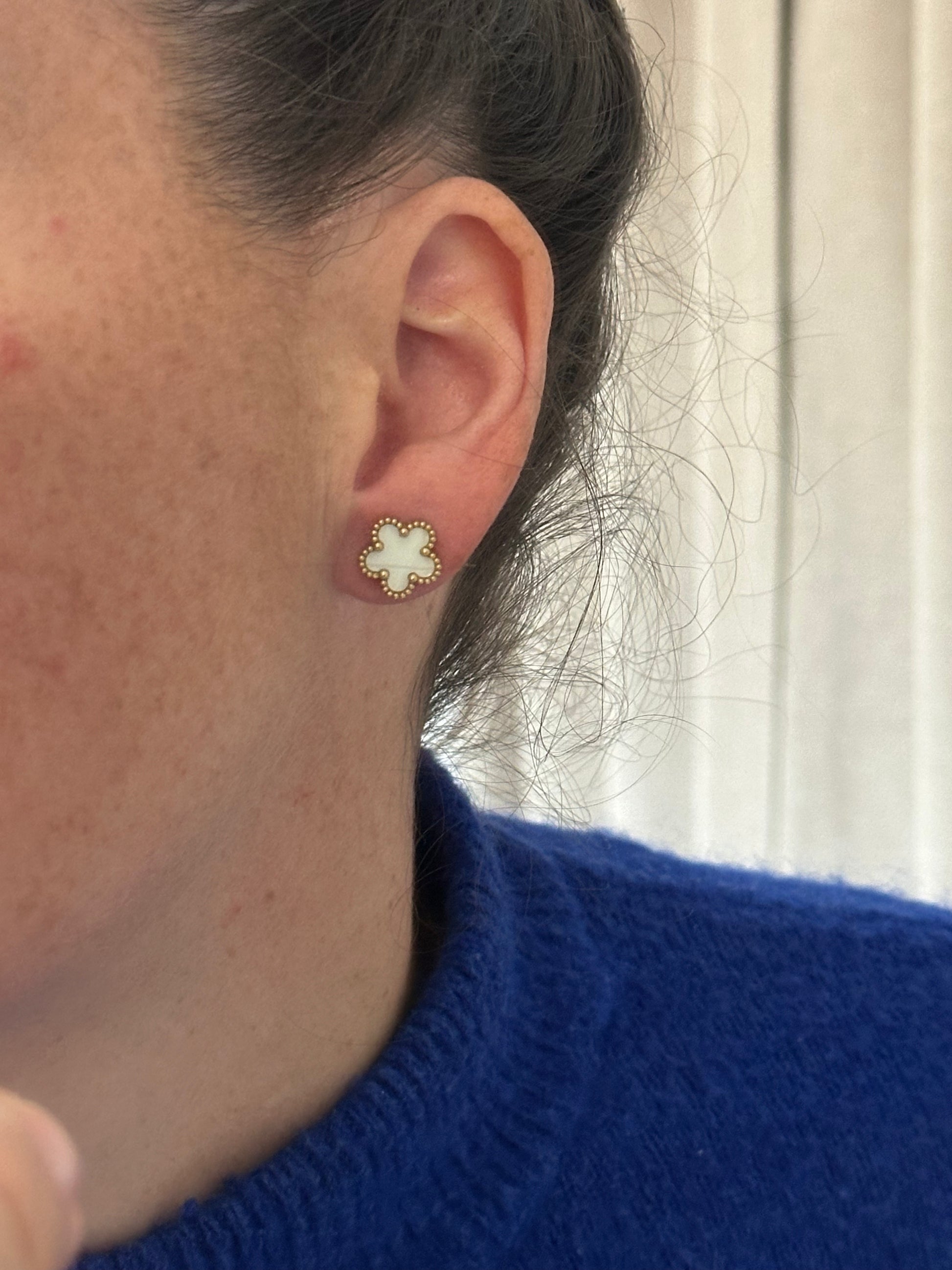 Ces boucles d'oreilles puces arborent une élégante fleur à cinq pétales, en nacre blanche, entourée d'un contour doré finement texturé. Le contraste entre la douceur de la nacre et la brillance du doré crée un effet délicat et sophistiqué. Parfaites pour celles qui cherchent à ajouter une touche florale et chic à leur look quotidien. Existe en collier et en bracelet.