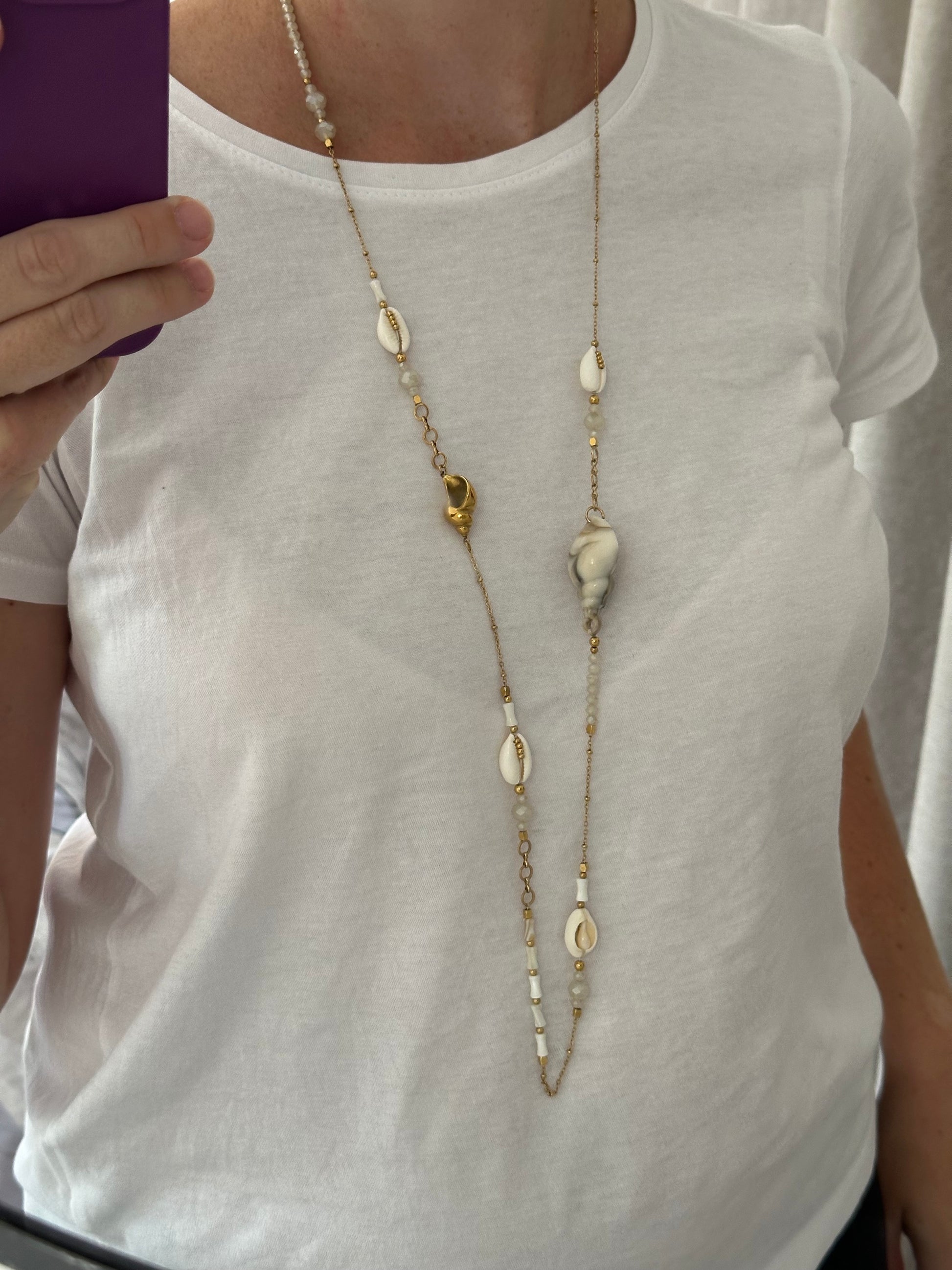 Ce collier en acier doré, se compose d’une fine chaîne dorée, ponctuée de perles en cristal, coquillages en résine, acier ou naturels, dans un bel équilibre entre élégance et esprit bord de mer pour femme. Le style est à la fois raffiné et organique, parfait pour une silhouette d’été ou une touche marine toute l’année. La longueur déployée est de 97 cm environ. Ce bijou est composé de nacres et de coquillages.